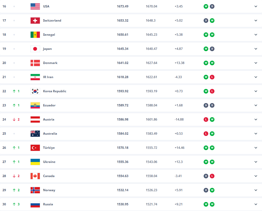 Сборная России под руководством главного тренера Валерия Карпина поднялась на три строчки по сравнению с предыдущим показателем – с 33 на 30-е.
