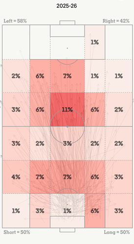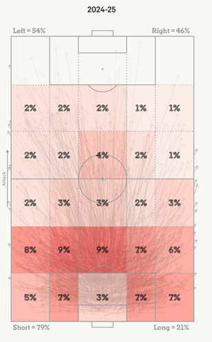Команда входит в тройку лидеров АПЛ по количеству длинных передач, хотя в прошлом сезоне была лишь на среднем уровне.