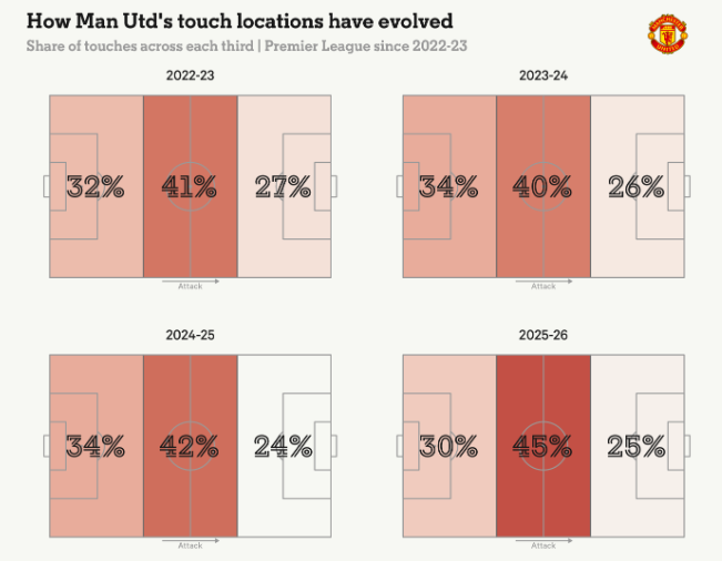Если в кампании-2024/25 «Юнайтед» атаковал пятым по медлительности темпом, то сейчас — восьмым по скорости.